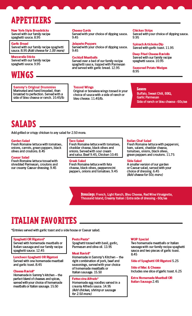 Homemade in Sammy’s Kitchen - the perfect blend of cheeses and spices, served with your choice of homemade meatballs or Italian sausage.