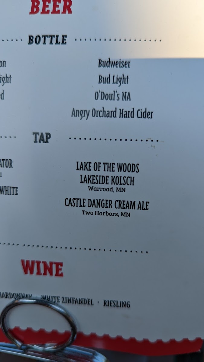 Tap - 5.00 Lake of the Woods Lakeside Kolsch, Castle Danger Cream Ale, Blue Moon Belgian White, Leinenkugel's Rotator, Blacklist IPA Bottle - 4.00 Pabst Blue Ribbon, Michelob Golden Light, Bell's Two Hearted, Coors Light, Budweiser, Bud Light, O'Doul's NA, Angry Orchard Hard Cider (4.50)